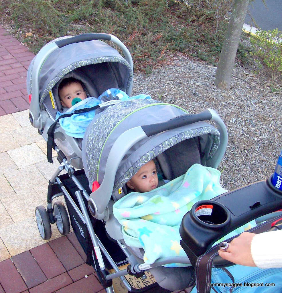 Till they were 6 months old, we used a double stroller stand. It was just a stand on wheels and all we had to do was secure their car seats on it. This was really convenient. The kids (then infants) would be in their car seats all the time, so even if they were napping we could just pull out the car seat and place it on the stand (and they were light sleepers so this was really good). It was also very light and easy to maneuver.